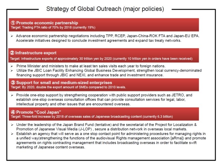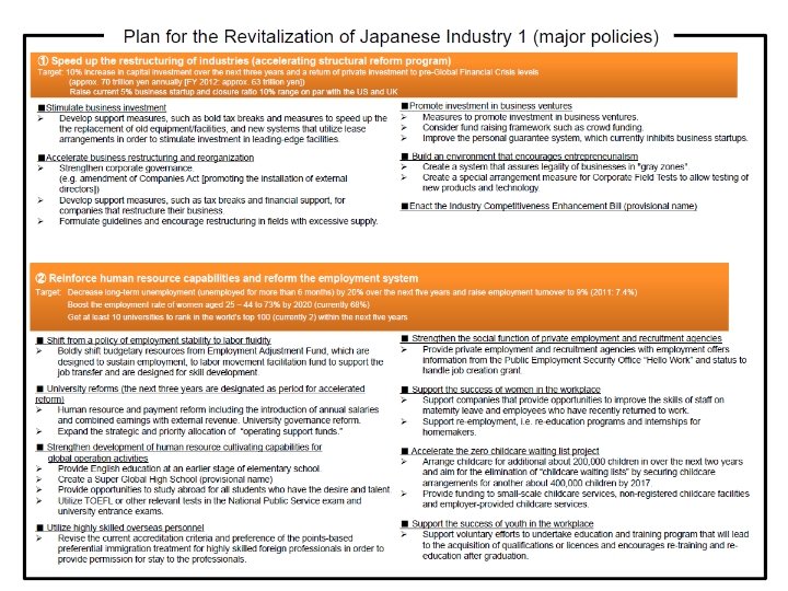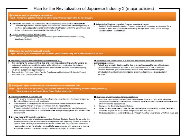 Comments (2014) Prof. Heizo Takenaka (Keio Univ. )— “New Growth Strategy is better received abroad than a year ago. ” Japan Economic Journal (June 30, 2014)— “This is the 9 th Growth Strategy of the Japanese government since 2001. None of the past Strategies produced results. Their contents were more or less similar: job creation, special zones, creating demand for environmental or medical industries, hiring young workers, etc. Short-lived governments had little time to work on policies. Subsidies were usually wasted. Ministries were happy to report new spending, but there was no monitoring of effectiveness. Unproductive policies must be ended. Money and policy must be directed to fewer programs. ”