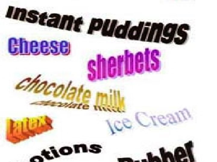 Applications using Red Algae Carrageenan FOOD (Nondairy): Frozen foods, Dessert gels, Pastry fillings Fruit juices, Syrups, Jams & Jellies, Bakery icings, Sauces and gravies, Relishes, Pimiento strips, Cooked/ instant puddings, Salad dressings, Chiffons FOOD (Dairy): Whipped toppings, Milk shakes, Skim milk, Evaporated milk, Chocolate milk, Cheeses, Cottage cheese, Infant formulas, Flans and custards, Yogurt, Instant breakfasts, Ice cream INDUSTRIAL: Air freshener gels, Tertiary oil treatment, Cleaners, Enzyme immobilization, Electrophoretic media, Chromatographic media