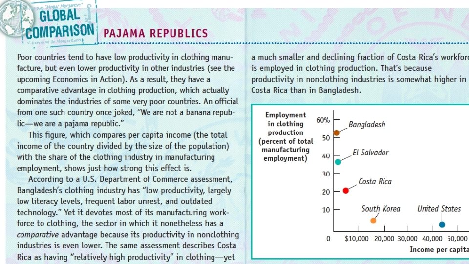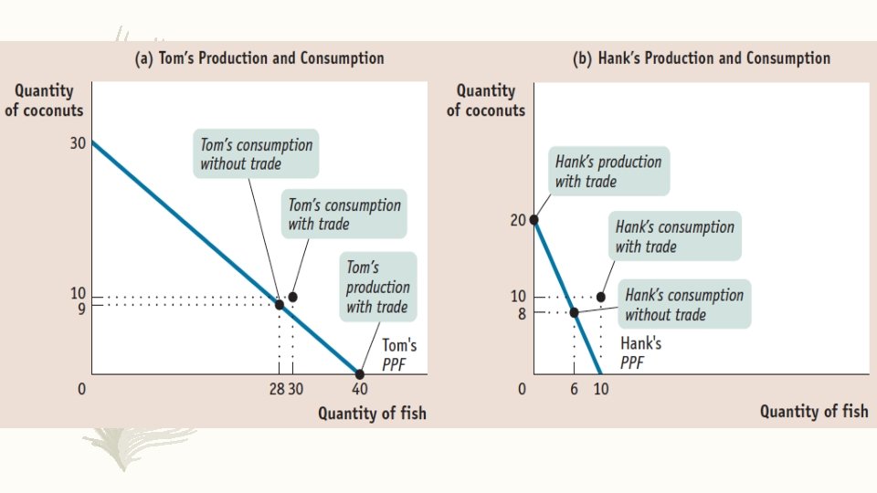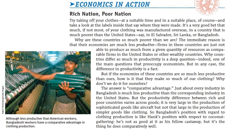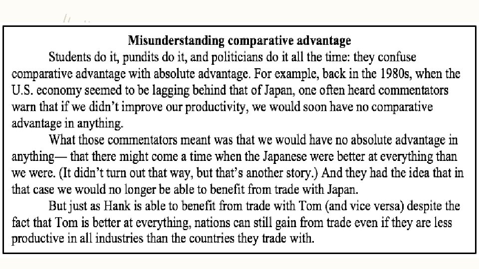 Lessons from the model – (1): by agreeing to specialize and provide goods to each other, Tom and Hank can produce more and therefore both be better off than if they tried to be self-sufficient – (2) as long as people have different opportunity costs, everyone has a comparative advantage in something, and everyone has a comparative disadvantage in something
