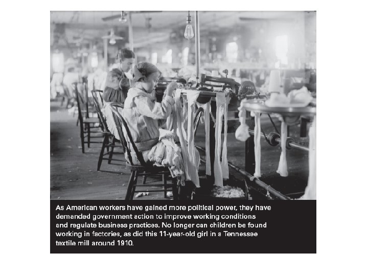 Econ Policy & Labor • Issues: wages & hours, contracts/collective bargaining, child labor, safety • Until 1914 Clayton Act, gov’t involved in disrupting unions • 1935 National Labor Relations Act/Wagner Act – Created Natl Labor Relations Board – Collective bargaining, unionizing protection
