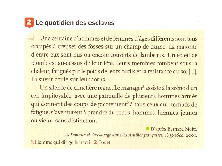 Document : Le travail forcé dans les plantations Chacun se rend avec sa pioche dans les plantations où ils travaillent presque nus, l’ardeur du soleil. (…) A la moindre négligence, on les attache par les pieds et par les mains, sur une échelle ; le commandeur armé d’un fouet de poste, leur donne sur leur derrière nu cinquante, cent, jusqu’à deux cents coups. Chaque coup enlève une portion de la peau. Ensuite, on détache le misérable tout sanglant ; on le met au cou un collier de fer à trois pointes, et on le ramène au travail. Bernadin de Saint-Pierre, Voyage à l’île de France, à l’île Bourbon et au cap de Bonne-Espérance, 1773.