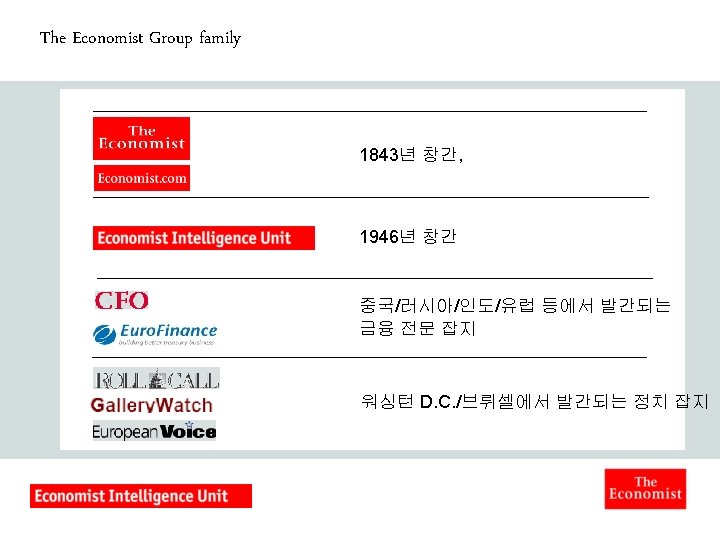 The Economist & CFO 신뢰성 Trusted 글로벌 Global 객관적 Objective 정확한 Accurate 적절한 Relevant 영향력 Influential 솔직한 Outspoken