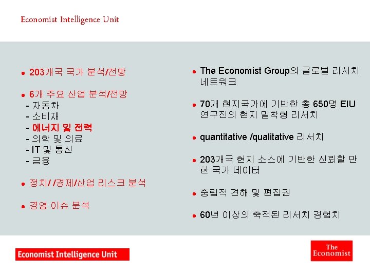 Economist Intelligence Unit § Country analysis and forecasting § Industry trends and market analysis § Risk assessment § Management strategies EIU Korea 김태현, 2012 10월