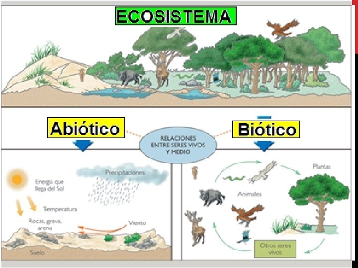 ECOSISTEMA Área determinada en la que se establecen relaciones entre los seres vivos FACTORES BIÓTICOS y los seres no vivos FACTORES ABIÓTICOS