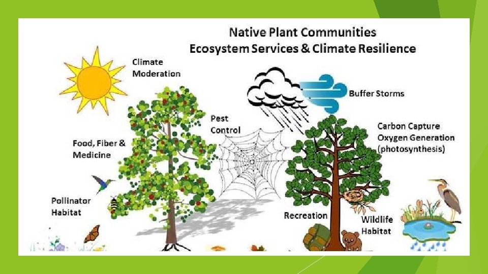 More Ecological Services Dispersal of seeds and translocation of nutrients Maintenance of biodiversity Protection from the sun’s harmful ultraviolet rays Partial stabilization of climate Moderation of temperature extremes and the force of winds and waves Support of diverse human culture Providing aesthetic beauty and intellectual stimulation that lift the human spirit.