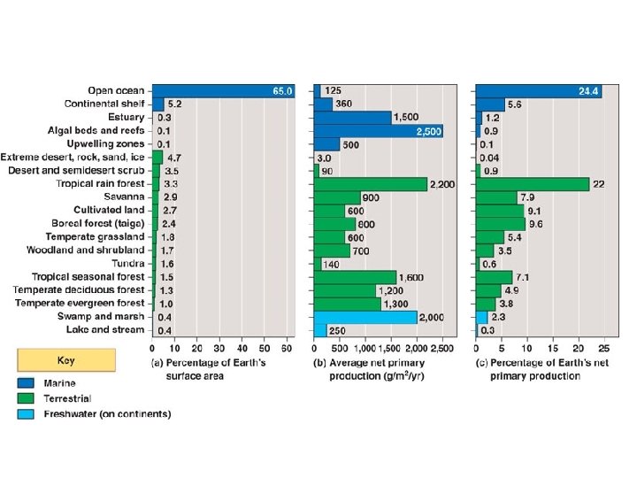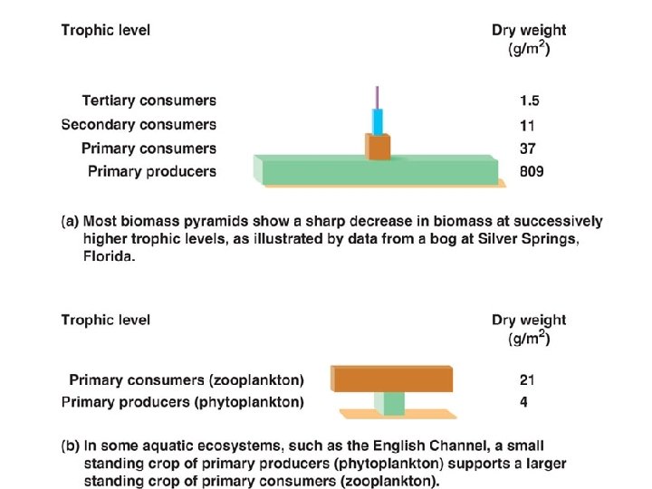 Ecosystem Energy Budgets l Primary production: amount of light energy converted to chemical energy by autotrophs in a given time period. – – l Sets the “spending limit” for the energy budget of the ecosystem Of the visible light that reaches the earth, only about 1% is converted to chemical energy by photosynthesis Biomass: amount of biological material in a group of organisms in an ecosystem (ex. weight of all trees)