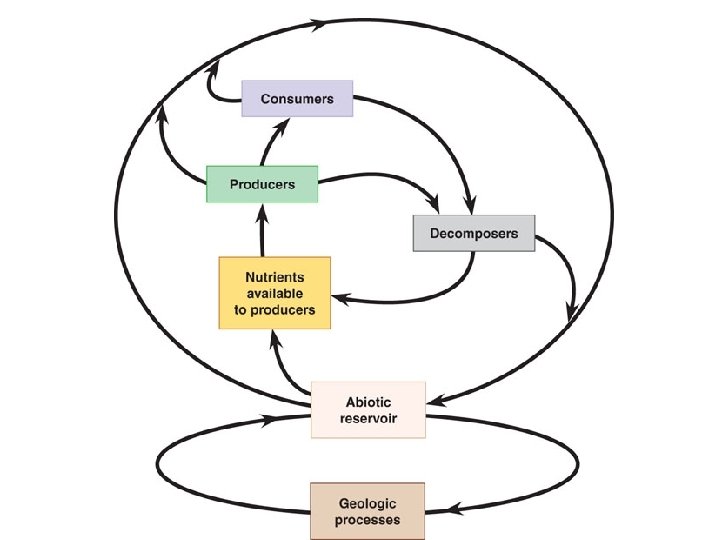 Nutrient Cycling in Ecosystems l l Within an ecosystem nutrients are cycled internally, there are leaks (outputs) like erosion and timber/crop harvest Must be replaced by nutrient inputs: – – Weathering of rocks Windblown dust Precipitation Decomposition into form available to plants