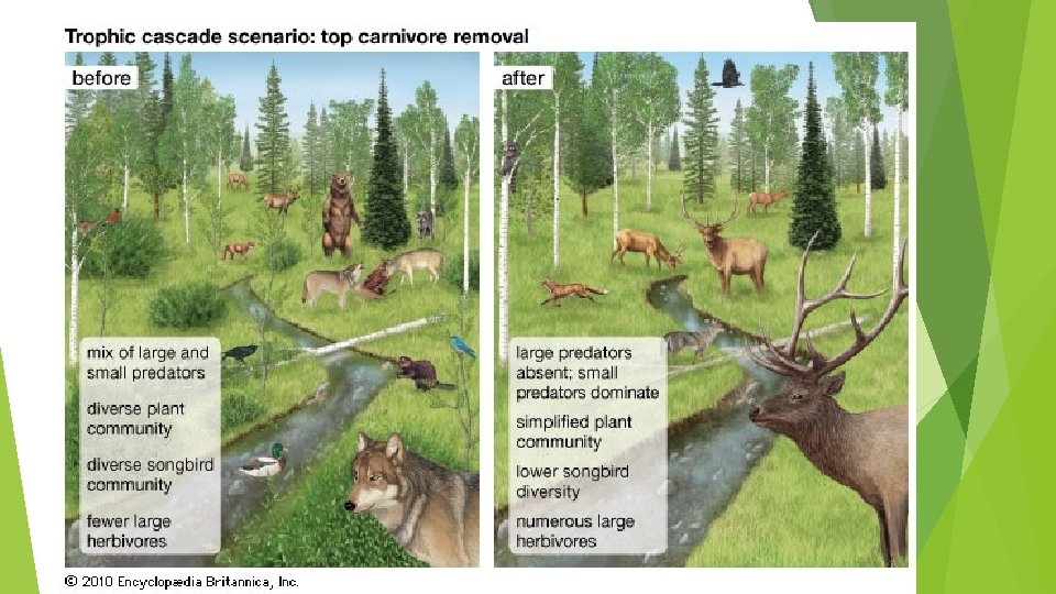 Trophic Cascade • powerful indirect interactions that can control entire ecosystems • when predators in a food web suppress the abundance of their prey, it allows the next trophic level to thrive • the addition or removal of top predators causes changes in the populations of predator and prey through a food chain