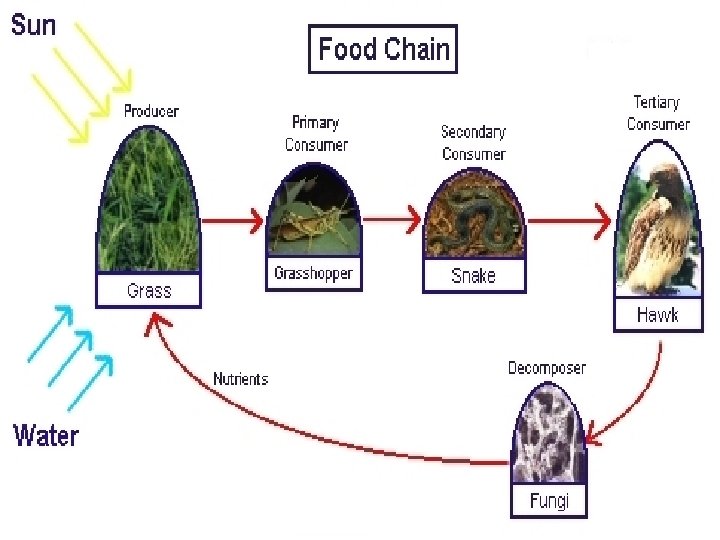 FOOD CHAINS Traces the path of energy as it moves from one organism to another. Everything starts with the SUN!! l l PRODUCERS gets the energy from the SUN PRIMARY CONSUMER (Herbivores/Omnivores) gets energy from the plants (producers) l SECONDARY CONSUMER gets the energy from the organisms it eats. l DECOMPOSER gets energy and recycles it back to the plants when organisms die or make waste products.