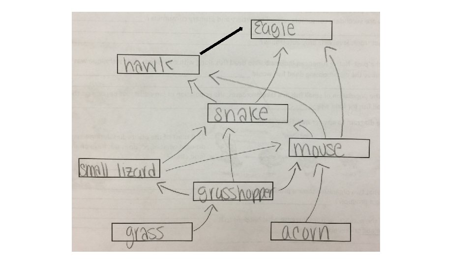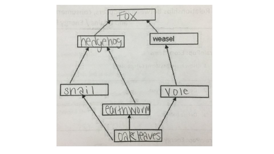 15. How is a food web different from a food chain? Food webs are a complex representation of the interactions of many organisms in an ecosystem, whereas food chains are simple and only show the interaction of a couple organisms. 16. What is the initial source energy for all ecosystems? Sun 17. How does energy move through an ecosystem? As food 18. What are 5 types of abiotic factors? (page 456) sun , soil, water, oxygen , fire 19. How are producers related to omnivores? Omnivores eat producers 20. How are secondary consumers related to tertiary and primary consumers? Secondary consumers eat primary consumers but are eaten by tertiary consumers 21. What tropic level eats only autotrophs? Primary consumers because autotrophs are plants and primary consumers are herbivoures. 22. In the past, Native American Indians buried dead fish along with corn seeds. This technique was used because the decomposing dead fish would give nutrients for the corn seeds to grow. 23. As the population of small fish in a lake decreases, the population of large fish that depend on the small fish for food will decreae.