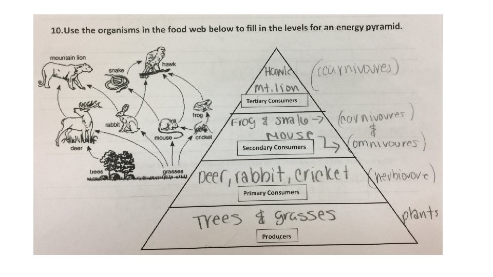 11. Which organism(s) can be described as producers? Trees and grasses 12. Which organism(s) can be described as heterotrophs? Deer, rabbit, cricket, front, snake, mouse, hawk, and mountain lion 13. Which organism(s) can be described an omnivore? Mouse 14. Which organism(s) can be described as a carnivore? Frog, snake, hawk, mountain lion