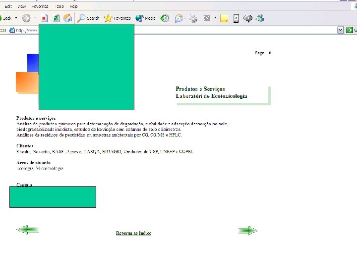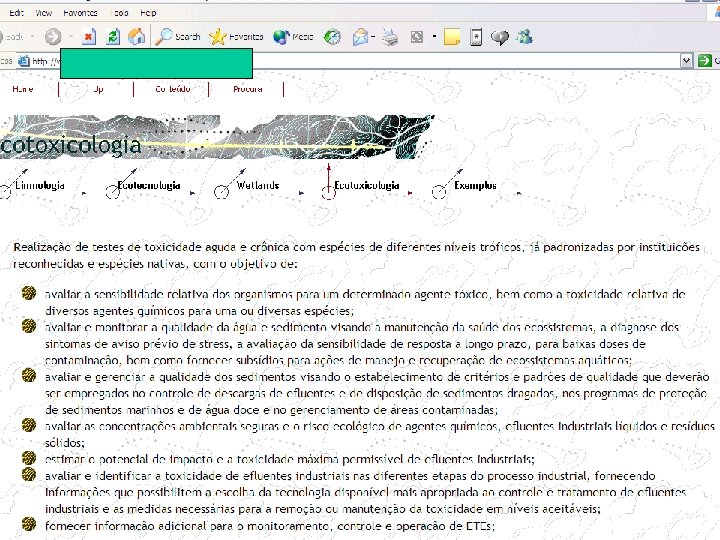 Objetivos mais comuns • Obtenção de dados para avaliação de risco e manejo ambiental. • Desenvolver e testar as exigências legais para o desenvolvimento e liberação de novos produtos. • Desenvolver princípios teóricos e empíricos para melhorar o conhecimentos sobre o comportamento e efeitos dos agentes químicos em sistemas vivos.
