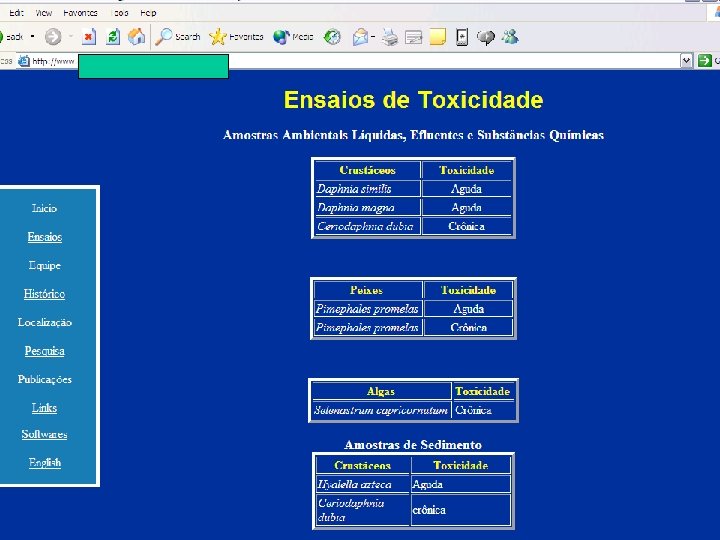 CETESB (1990), IAP (2006) recomendam: • Teste inicial deve ser aplicado com Daphnia similis ou Daphna magna • Organismos de grande sensibilidade a uma elevada diversidade de poluentes • Teste é rápido (até 96 horas) • Avalia a toxicidade aguda