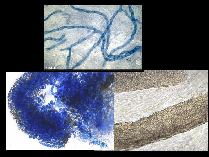 DERMATOPHYTIES - DIAGNOSTIC - 1 EXAMEN DIRECT DES ECHANTILLONS : * squames, ongles, cheveux éclaircis dans KOH + colorant * les prélèvements doivent être abondants * mise en évidence de filaments, spores.