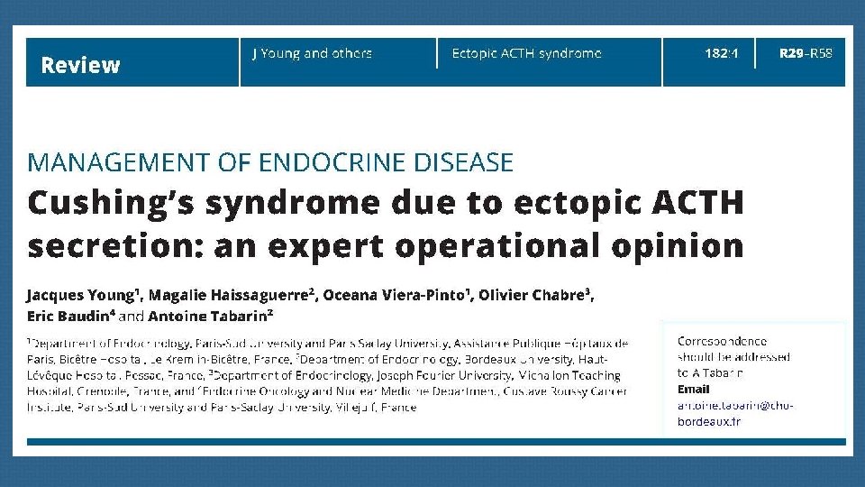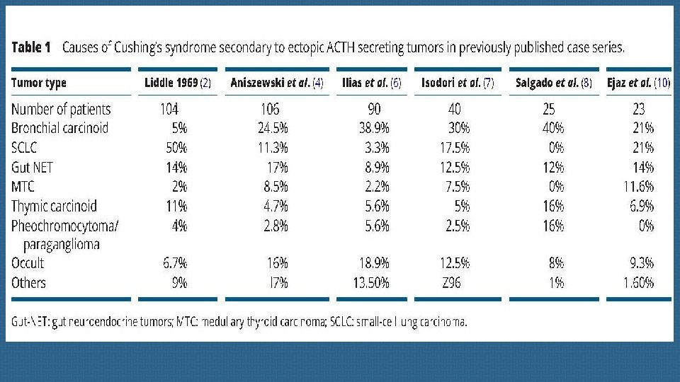 Ectopic ACTH syndrome (EAS) is rare but is frequently a severe EAS should often be considered as an endocrine condition. emergency requiring an emergency response both in terms of diagnostic procedures and therapeutic interventions. endocrinology teams in collaboration with specialized hormonal laboratory, modern imaging platforms and intensive care units.