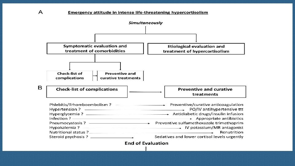 Prophylaxis of Pneumocystis jirovecii pneumonia with sulfamethoxazoletrimethoprim is recommended for all patients with intense hypercortisolism. In a recent survey issued from the European Register on Cushing’s Syndrome (ERCUSYN) registry, infections were the most common cause of death during the 3 months following diagnosis, emphasizing the need for clinical vigilance at that time, especially in patients with intense hypercortisolism and diabetes mellitus.