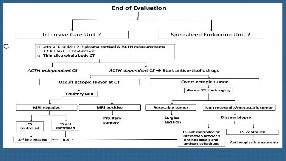 First-line imaging procedures Spiral thin-slice CT of the cervical-thoracic-abdominal and pelvic regions is essential , together with pituitary MRI, in severe ACTH-dependent Cushing’s syndrome. New technologies such as c 11 C-methionine PET have been proposed to visualize occult pituitary microadenomas, but these are still part of clinical research and are not compatible in this context of emergency. One of the main diagnostic issues is bronchial carcinoids which represent one of the main causes of EAS.