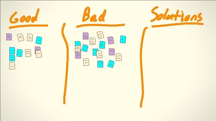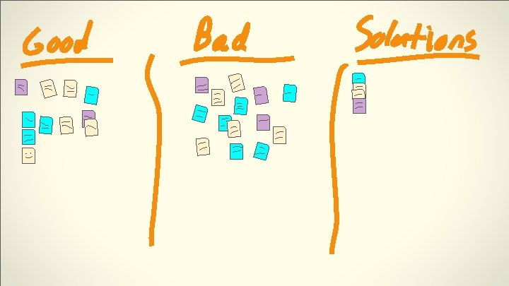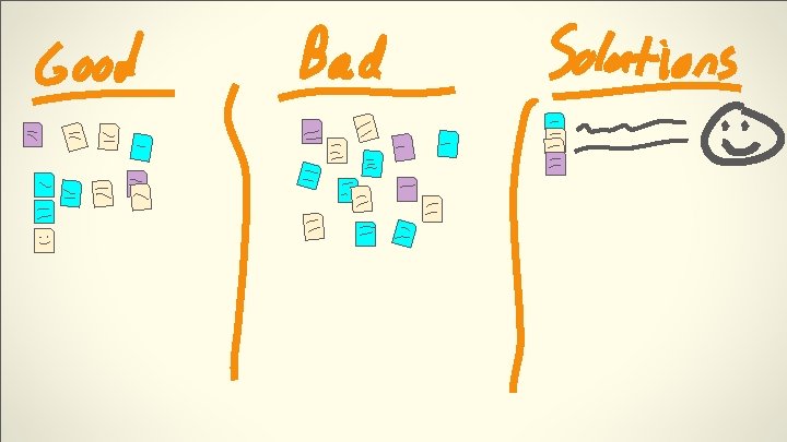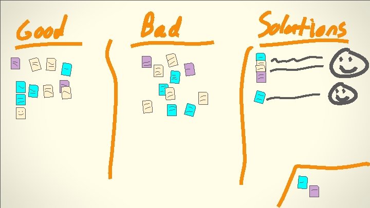 How to conduct a retrospective (There are so many ways) ● Today I will focus on my favorite way to conduct a retrospective ● 1 hour, post-its, a wall, an open mind, the entire Team ○ ● You can be the entire Team. You can use this to evaluate your own progress or processes Even retrospectives are a process that we are always evolving ○ We just had a retrospective about retrospectives!! ○ Always ask, "Is there a better way"