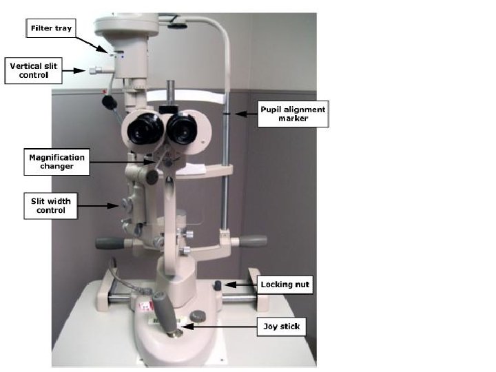 The Slit Lamp • Low- to medium-powered binocular horizontally mounted microscope 1) 2) 3) 4) 5) 6) Magnification Elevation Joystick for R/L movement & to focus Slit width &/or height Slit centration or offset Slit height & Intensity
