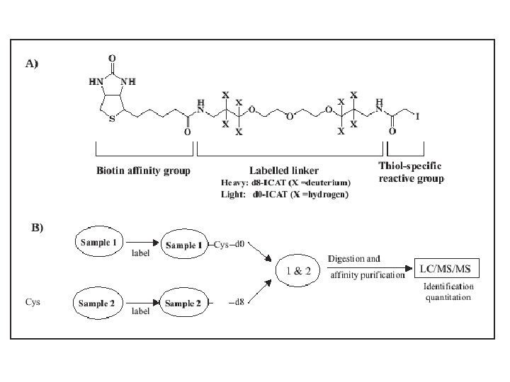 Hogyan jelölhetünk? • ICAT (Isotope-Coded Affinity Tags) – Cys-oldalláncának alkilezése, könnyű (H 8) és nehéz (D 8) alkil-csoporttal → amiben nincs Cys, az kiesik → a deuterált vegyület retenciós ideje kicsit hosszabb azonosítás: MS-MS alapon kvanti: MS-alapon relatív intenzitásokból ingadozás: van az 30% is!