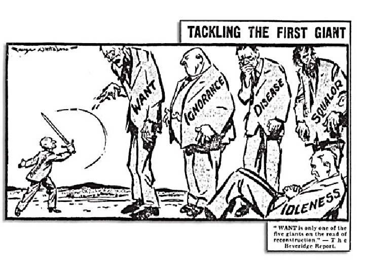 The Beveridge Report �Set up in 1941 �Led by Sir William Beveridge �Published report in 1942 �Said that the government needed to attack Five Giant “Evils”: Q -W �Squalor wa s t hat B �Ignorance eve he Re rid p �Want wh ort ge at and �Idleness aim did �Disease tac to it kle ?
