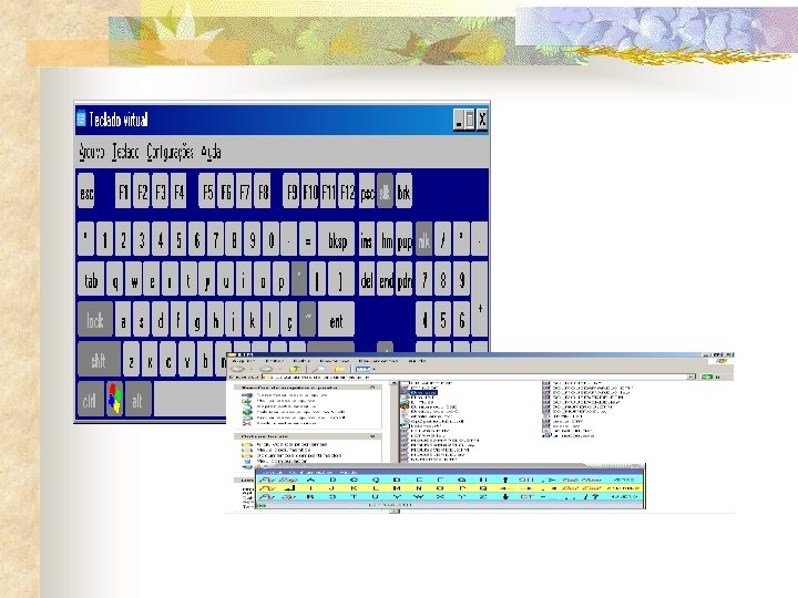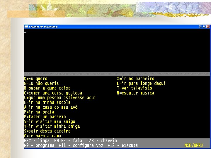 Sistemas com varredura n n São apresentadas opções na tela, uma a uma Com um acionador a opção desejada é escolhida. n Ex: switch, microfone, mouse ocular, etc. . .