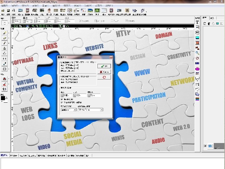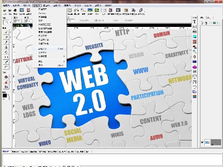 Steps to reduce the size of an imange and lower the resolution Choose 影像 =>影像大小. (If you don‘t want your original image to lose quality, make a copy of it by choosing 檔案 => 另存影像and giving the copy a new name. Then resize the copy for your Web site 1.