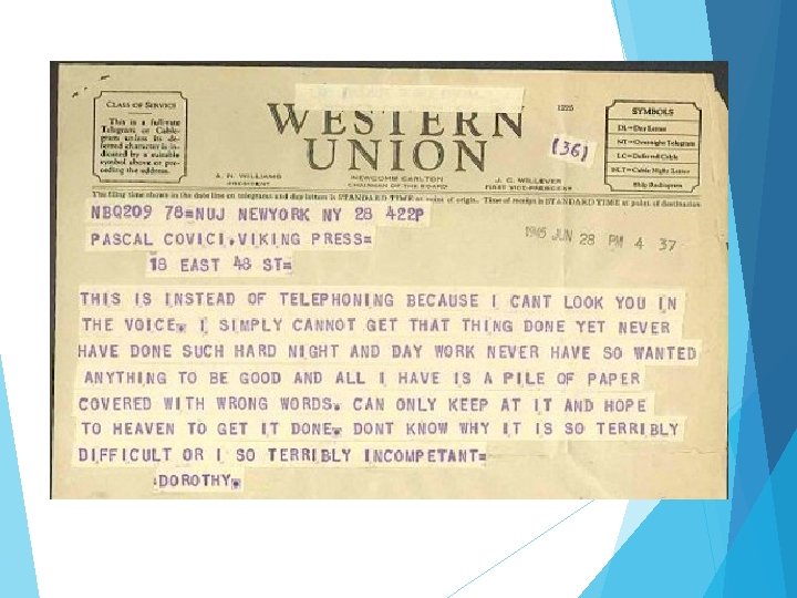 WESTERN UNION 1945 JUN 28 PM 4 37 NBQ 209 78=NUJ NEWYORK NY 28 422 P PASCAL COVICI. VIKING PRESS= 18 EAST 48 ST= THIS IS INSTEAD OF TELEPHONING BECAUSE I CANT LOOK YOU IN THE VOICE. I SIMPLY CANNOT GET THAT THING DONE YET NEVER HAVE DONE SUCH HARD NIGHT AND DAY WORK NEVER HAVE SO WANTED ANYTHING TO BE GOOD AND ALL I HAVE IS A PILE OF PAPER COVERED WITH WRONG WORDS. CAN ONLY KEEP AT IT AND HOPE TO HEAVEN TO GET IT DONE. DONT KNOW WHY IT IS SO TERRIBLY DIFFICULT OR I SO TERRIBLY INCOMPETANT= DOROTHY. Dorothy Parker to her editor, Pascal Covici (Source Nancy Campbell archives via Letters of Note)