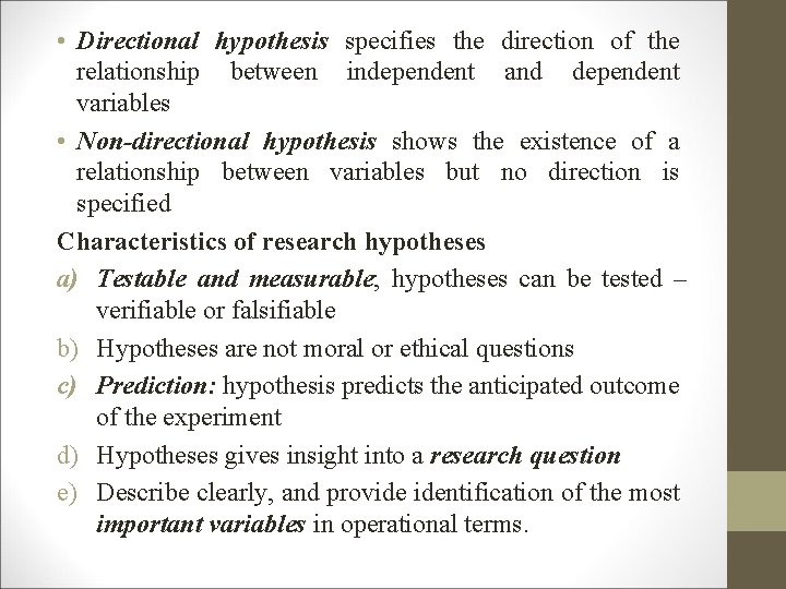 • Directional hypothesis specifies the direction of the relationship between independent and dependent variables • Non-directional hypothesis shows the existence of a relationship between variables but no direction is specified Characteristics of research hypotheses a) Testable and measurable; hypotheses can be tested – verifiable or falsifiable b) Hypotheses are not moral or ethical questions c) Prediction: hypothesis predicts the anticipated outcome of the experiment d) Hypotheses gives insight into a research question e) Describe clearly, and provide identification of the most important variables in operational terms.
