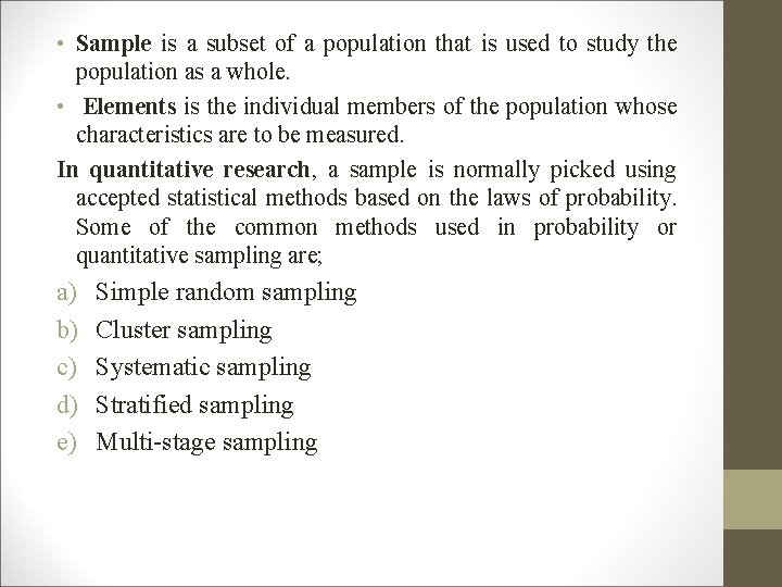• Sample is a subset of a population that is used to study the population as a whole. • Elements is the individual members of the population whose characteristics are to be measured. In quantitative research, a sample is normally picked using accepted statistical methods based on the laws of probability. Some of the common methods used in probability or quantitative sampling are; a) b) c) d) e) Simple random sampling Cluster sampling Systematic sampling Stratified sampling Multi-stage sampling