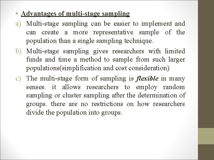 • Advantages of multi-stage sampling a) Multi-stage sampling can be easier to implement and can create a more representative sample of the population than a single sampling technique. b) Multi-stage sampling gives researchers with limited funds and time a method to sample from such larger populations(simplification and cost consideration) c) The multi-stage form of sampling is flexible in many senses. it allows researchers to employ random sampling or cluster sampling after the determination of groups. there are no restrictions on how researchers divide the population into groups.