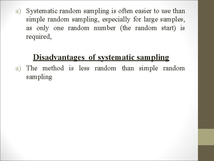 a) Systematic random sampling is often easier to use than simple random sampling, especially for large samples, as only one random number (the random start) is required, Disadvantages of systematic sampling a) The method is less random than simple random sampling
