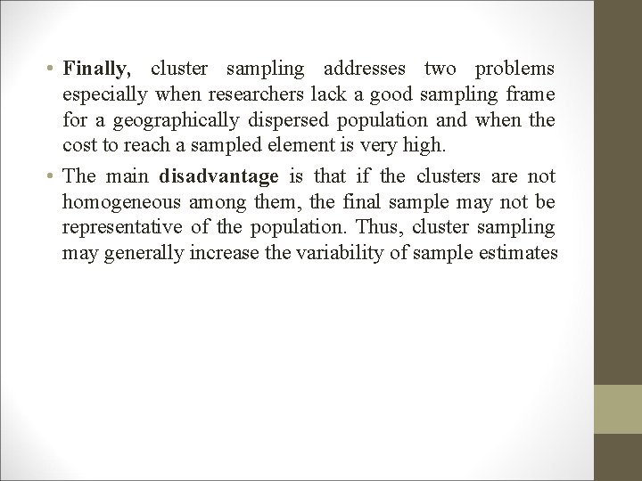• Finally, cluster sampling addresses two problems especially when researchers lack a good sampling frame for a geographically dispersed population and when the cost to reach a sampled element is very high. • The main disadvantage is that if the clusters are not homogeneous among them, the final sample may not be representative of the population. Thus, cluster sampling may generally increase the variability of sample estimates