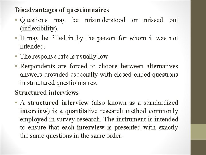 Disadvantages of questionnaires • Questions may be misunderstood or missed out (inflexibility). • It may be filled in by the person for whom it was not intended. • The response rate is usually low. • Respondents are forced to choose between alternatives answers provided especially with closed-ended questions in structured questionnaires. Structured interviews • A structured interview (also known as a standardized interview) is a quantitative research method commonly employed in survey research. The instrument is intended to ensure that each interview is presented with exactly the same questions in the same order.