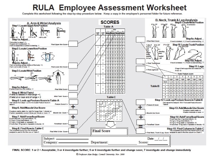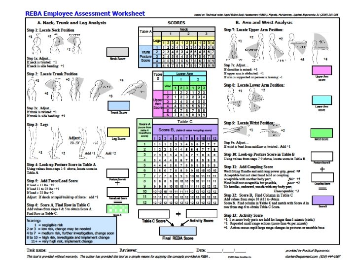 REBA/RULA �RULA: Rapid Upper Limb Assessment (Mc. Atamney & Corlett, 1993) �REBA: Rapid Entire Body Assessment (Hignett & Mc. Atamney, 2000)