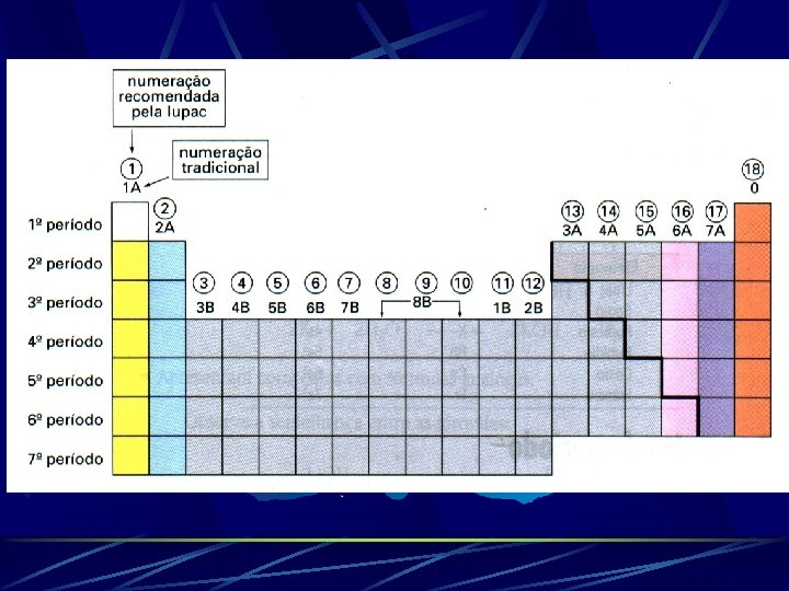 Exemplo: Sódio (Na) – Z = 11 1 s² 2 p 6 3 s¹ Período: 3º Família: IA – Metais Alcalinos