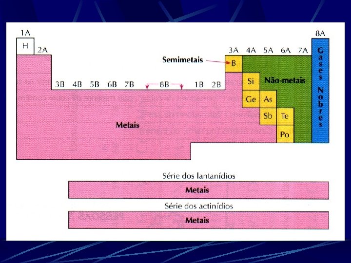 · Metais (76% da tabela): são bons condutores de calor e eletricidade, dúcteis, maleáveis, sólidos em condições ambientes (exceção do mercúrio, Z = 80, que é líquido); · Não-metais ou ametais (11% da tabela): são maus condutores de calor eletricidade, não são dúcteis, nem maleáveis. Sólidos: B, C, Si, P, As, Se, Te, I e At; líquido: Br; Gasosos: N, O, F e Cl; · Gases nobres (6% da tabela): quimicamente inertes. São todos gases em condições ambiente. · Semimetais: esses elementos teriam caractéristicas de metais e ametais, porém hoje já se consegue separá-los corretamente, embora muitos vestibualres ainda utilizam esse classe…(B, Si, ge, As, Sb, Te e Po); Ocorrência dos elementos químicos Temos 88 elementos naturais e 24 artificiais ( cisurânicos : inferior a Z = 92: tecnécio (Tc), astato (At), frâncio (Fr) e promício (Pm); transurânicos : todos aqueles com número atômico superior a 92); São elementos radioativos aqueles que apresentam número atômicos maior ou igual a 84.