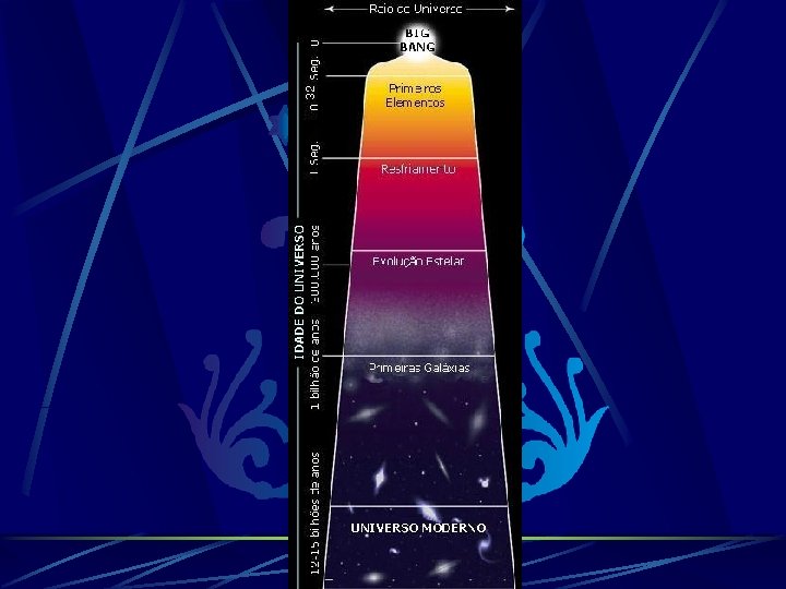 A Teoria do Big Bang O Big Bang é o momento da explosão que deu origem ao Universo, entre 12 e 15 bilhões de anos. A partir do primeiro centésimo de segundo após a explosão o Universo começou a evoluir. A evolução do Universo teve início, logo após a explosão de uma bola de matéria compacta, densa e quente, com um volume aproximadamente igual ao volume do nosso sistema solar. Essa explosão desencadeou uma série de eventos cósmicos, formando as Galáxias, as Estrelas, os Corpos Planetários e eventualmente, a vida na Terra. Esta evolução é consequência das reações nucleares entre as partículas fundamentais do meio cósmico, cujo efeito mais importante, foi a formação dos elementos químicos, através do processo de nucleosíntese. Pesquisas realizadas nos últimos trinta anos, consideram duas principais fontes responsáveis pela síntese dos elementos químicos: 1. Nucleosíntese durante o Big Bang; 2. Nucleosíntese durante a evolução estelar.