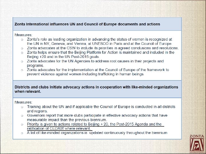 Plan an Advocacy Campaign • Know your issue • Establish your objectives • Examine interests of all stakeholders • Develop a strategy • Have the initiative approved by your District Governor and Advocacy Chairman • Identify & mobilize required resources • Use advocacy tools/guidance on Zonta. org website • Follow ZI Bylaws, Advocacy & Affiliation policies • Implement strategy; monitor progress