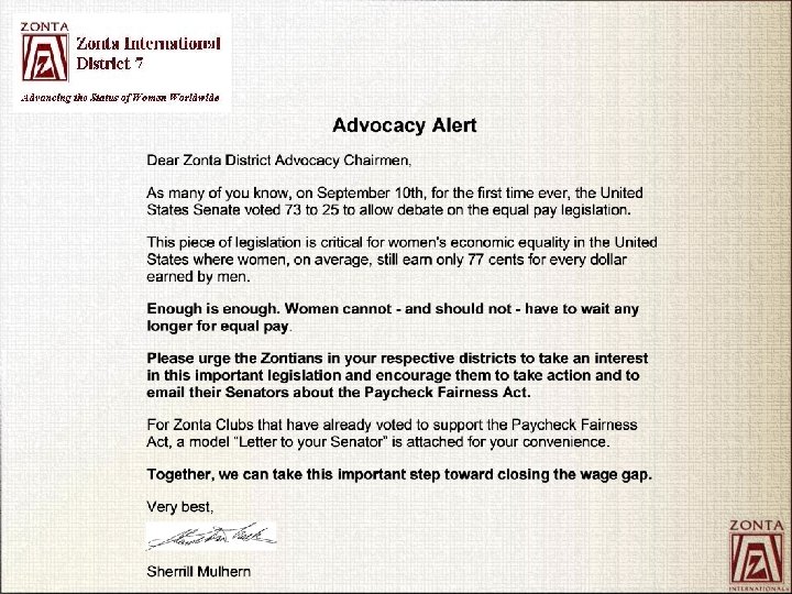 Advocate for what? District 7 Advocacy Platform Whereas, Zonta International District 7 seeks to advance the status of women through timely communications of clearly-stated positions, and Whereas, there is agreement that the following issues are of common concern to all members of the District: • Achieving pay equity S. 84: Paycheck Fairness Act • Ensuring equal rights under the law Ratification : ERA, CEDAW • Women in Scientific, Social & Political Leadership S. 288: Women and Minorities in STEM Booster Act of 2013 • Supporting measures to oppose gender-based violence, such as trafficking, rape, & domestic violence, H. R. 6087: International Protecting Girls by Preventing Child Marriage Act of 2012
