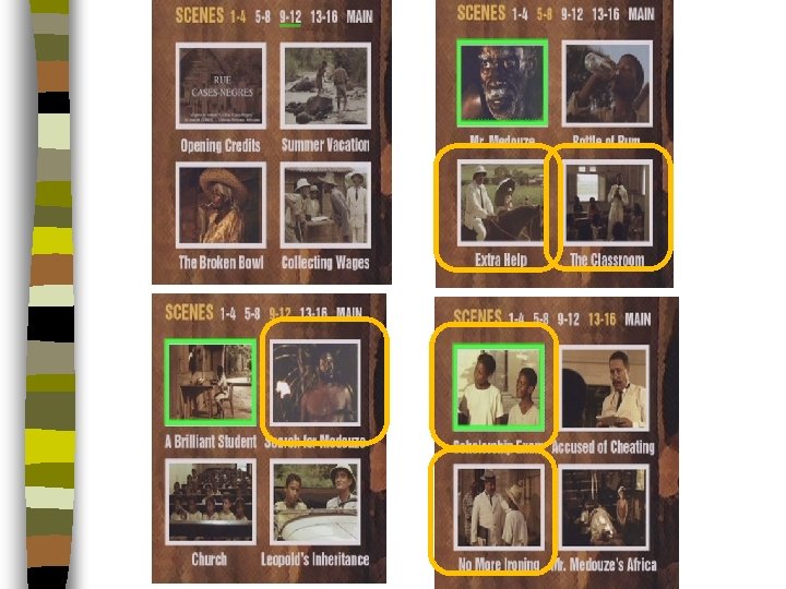 Education of Jose –not only from school n Medouze – Teaching about Nature (clip; 38: 45) M’s death 50: 00 – Black self-identity (clip; 19: 39) n Grandmother – Does not let him work as a laborer – Supportive and Persistent, working hard to support him n The teachers – 1) Sends him to take tests – 2) After the suspicion of plagiarism gets cleared up, gives him full scholarship. n Self education/discipline – – Genuine sensitivity in language 42: 00) loving to his elders; Endure hunger Asserting his right (Leonce episode) and aware of his cultural