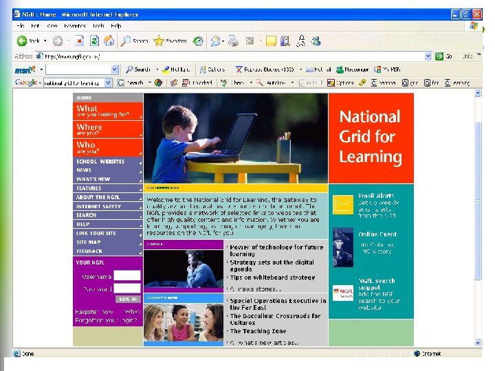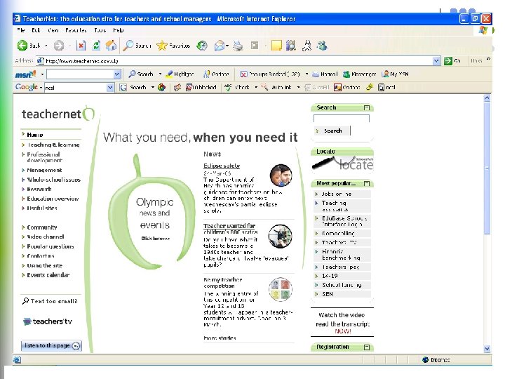 Using ICT in the training of teachers • CMC for the sharing of good practice and resources Medheads, Herts good practice network • CD-Rom and Web-based support for non-specialist teachers both in the primary sector. • Online CPD portfolio development • Sir John Lawes School Learning Lounge. • National grid for Learning • Teachernet. gov. uk