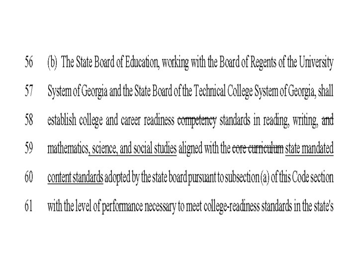• GEORGIA STATUTES AND CODES • § 20 -2 -141 - Review of competencies and core curriculum • O. C. G. A. 20 -2 -141 (2010) The State Board of Education shall establish at least once every four years a review of the adopted competencies and uniformly sequenced core curriculum by a task force broadly representative of educational interests and the concerned public. After considering the findings and recommendations of the task force, the state board shall make such changes in the student competencies lists and core curriculum as it deems in the best interest of the state and its citizens and shall report such proposed changes to local school systems and the General Assembly for review.