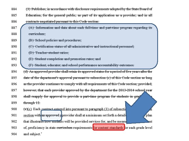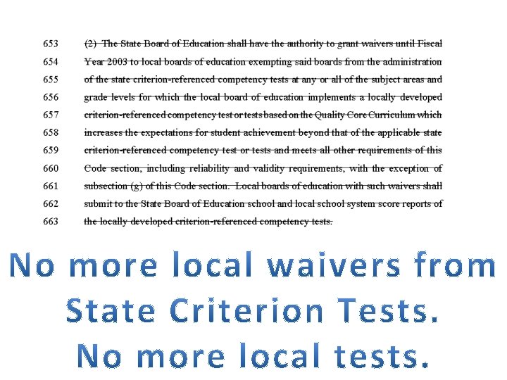 HB 897 No separate content tests Charter schools No timely reports State control of Special Education Testing Career Clusters No test waivers Mandated Unaccountable Fee based Online learning SB 167 Criterion Referenced Assessments Authority to Appointed State BOE State Mandated Content Standards Math, ELA, Science, Social Studies No More Reading Appointed Content Standards Advisory Council No data collection/sharing (in certain categories) unless: 1. Explicitly required by federal law 2. For special needs students