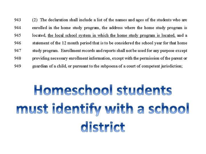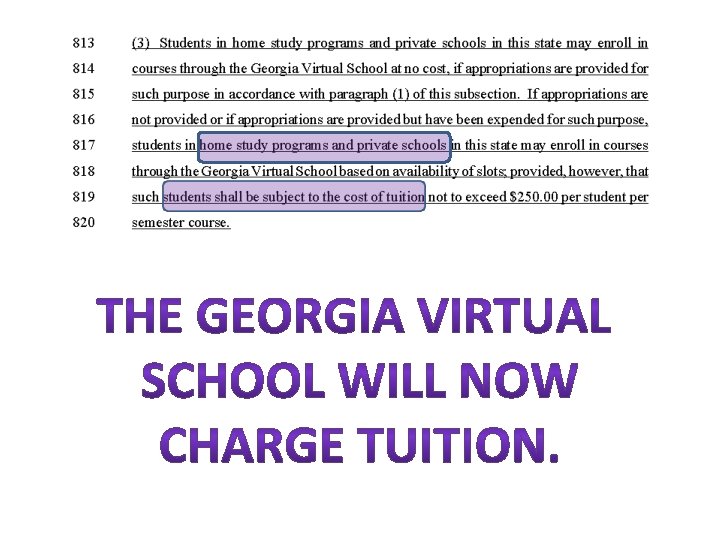 HB 897 No separate content tests Charter schools No timely reports State control of Special Education Testing Career Clusters Homeschool Mandated Unaccountable Fee based Online learning SB 167 Criterion Referenced Assessments Authority to Appointed State BOE State Mandated Content Standards Math, ELA, Science, Social Studies No More Reading Appointed Content Standards Advisory Council No data collection/sharing (in certain categories) unless: 1. Explicitly required by federal law 2. For special needs students