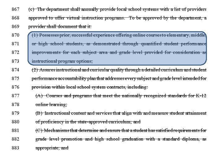 Repeal. Try to repeal these bills: SB 289 This bill requires the State Board of Education to establish rules and regulations that maximize online learning. By 2015 -2016, this bill requires the State Board of Education to offer all end of course assessments online. The online learning must be approved by the appointed State Board of Education. A local school system shall not prohibit it, even if an equivalent class is offered in person. The local school systems shall pay for it. Parents, citizens and local officials are by passed with these requirements.