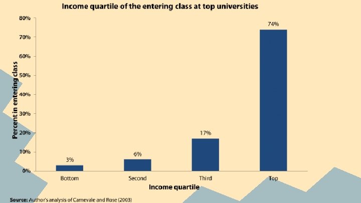 What social class apply more to college? “A recent Brooking study found that just 8% of low-income students applied to a “reach” school and just 34% of highachieving students in this group attended one of the country’s 238 most selective universities. (The study defined low income as being in the bottom fourth, income-wise, of families with a senior in high school. For 2008, the year studied, low-income meant a family income below $41, 472. )”(Mc. Grath).