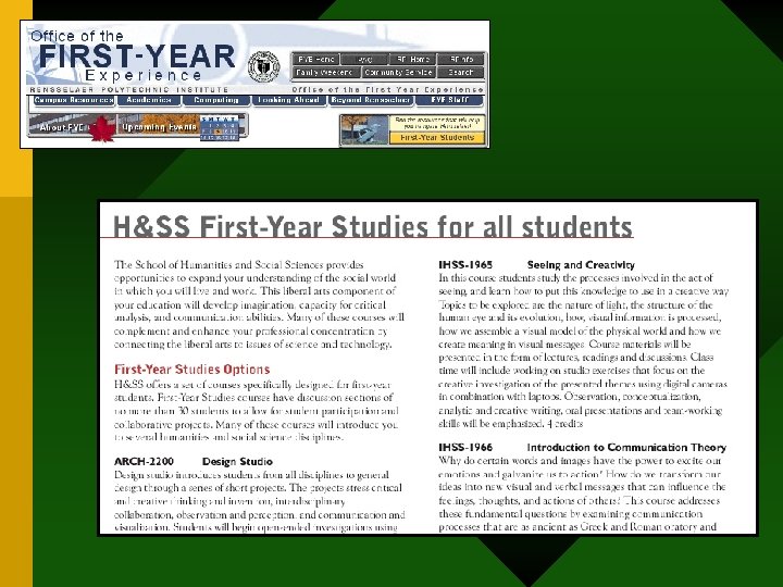 Rensselaer’s First Year Studies Program • Defined Pedagogic Strategies • Faculty Development Workshops • Critical thinking • Writing & communications • Teamwork & group work • Personal instructional attention • Focus on learning environment & community • Diversity & diverse learning styles • Appropriate use of instructional technology – 2 -day annual PAID workshops • Faculty Advisory committee – Community of Teachers