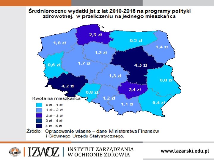 Niewiele samorządów decyduje się na wydatkowanie środków finansowych na programy polityki zdrowotnej. W 2015 r. wyniósł tylko 0, 04 proc. ogółu wydatków samorządów (178 programów, 38 mln zł). Programy samorządowe - efektywna promocja i pomiar efektów STAN OBECNY BADANIE NIK* (2015 r. ) W przeliczeniu na jednego mieszkańca JST przeznaczały na programy polityki zdrowotnej średnio w latach 20102015: • najwięcej – 4, 3 zł w woj. mazowieckim, • najmniej – 0, 3 zł w woj. warmińsko-mazurskim, • Najwięcej województw (całość JST) przeznaczało ok. 1 -2 zł na mieszkańca. * Realizacja programów polityki zdrowotnej przez jednostki samorządu terytorialnego, Departament Zdrowia NIK, Nr ewid. 10/2016/P/15/063/KZD. www. lazarski. pl