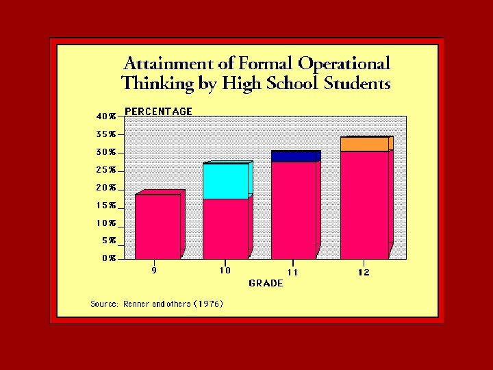 The formal operational stage 11 -adult (? ) • Formal operational stage (Adolescence and adulthood). In this stage, intelligence is demonstrated through the logical use of symbols related to abstract concepts. Early in the period there is a return to egocentric thought. Only 35% of high school graduates in industrialized countries obtain formal operations; many people do not think formally during adulthood.